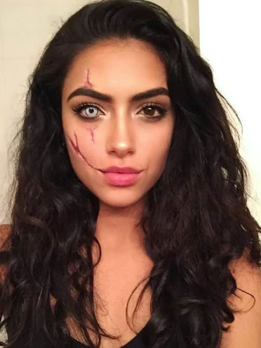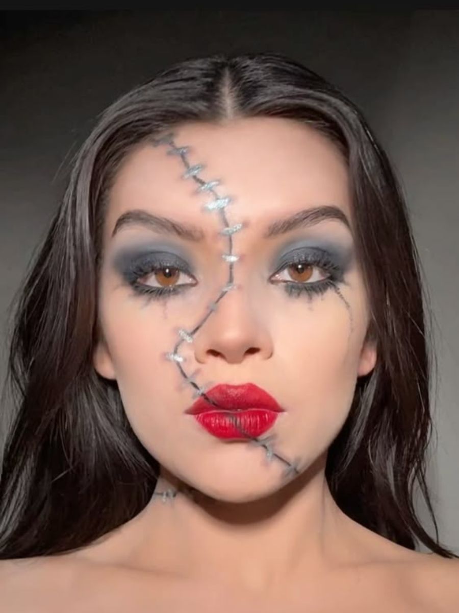 Machiajul de zombie, mai glam decât l-ai văzut vreodată. Un adevărat look de petrecere tematic, pe care îl poți recrea folosind, ca bază, produsele din colecția de machiaj de toamnă proprie, punând accent pe nuanțe închise pentru a crea efectele de umbre și adâncimi pe față. Pentru cusături te va ajuta să ai la îndemână un tuș sau un creion de ochi.