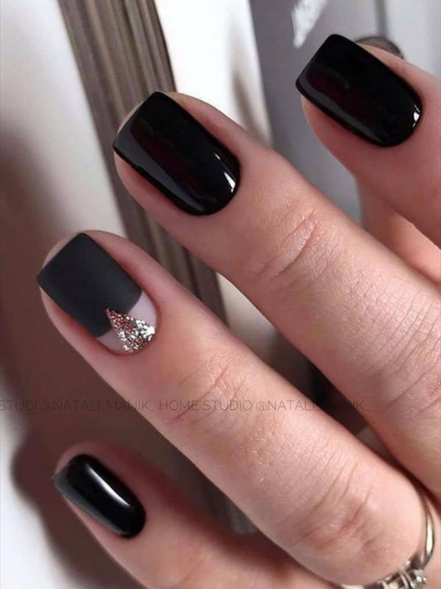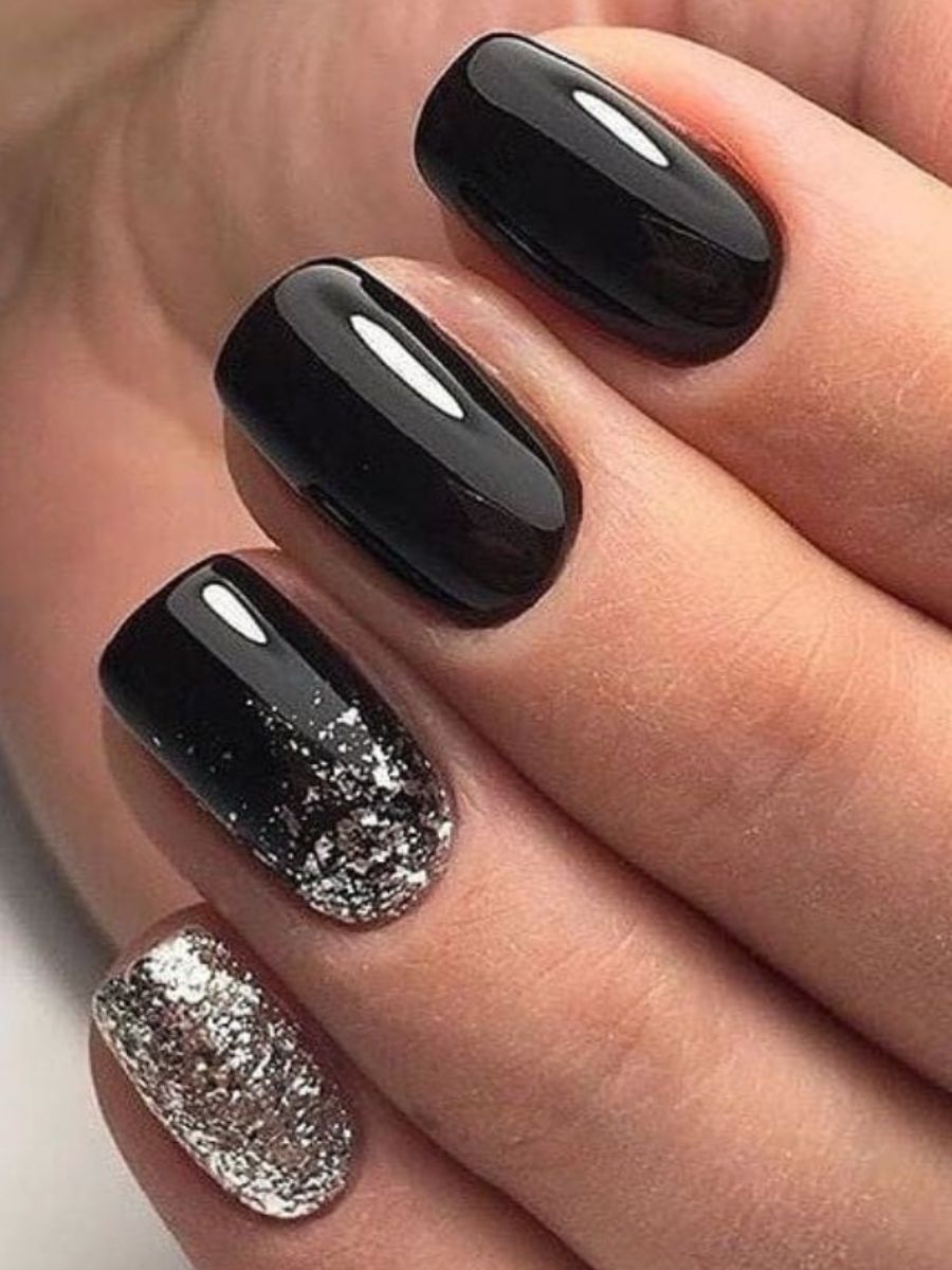 Nail art cu unghii negre – combinații cu auriu și sclipici